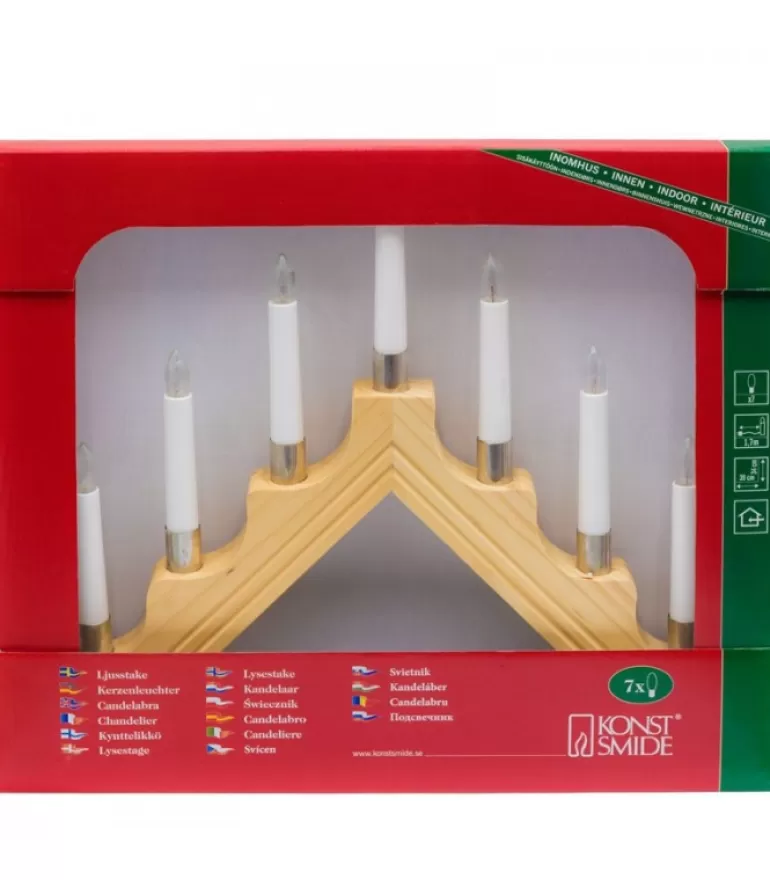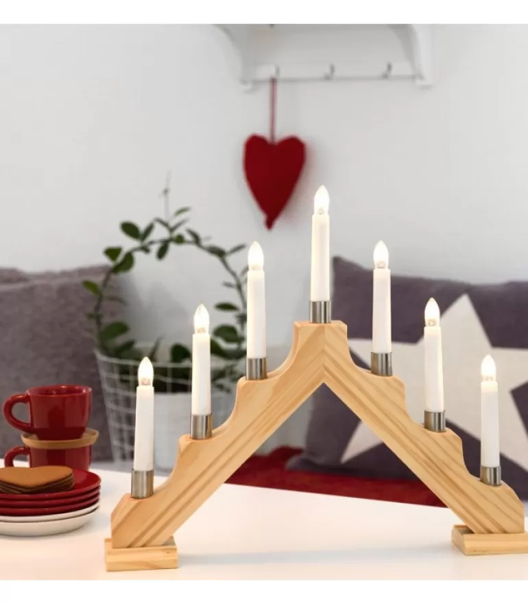 Chandelier Pyramide En Bois A Bougie Electrique, Couleur Bois Naturel Avec Bague Metal.