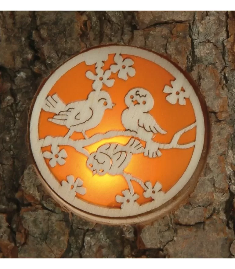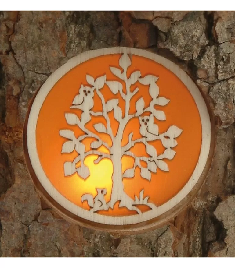 Photophore Dans Un Rondin De Bois Avec Trois Motifs Translucides : Oiseaux Sur Une Branche, Hiboux Dans Un Arbre Et Anim…